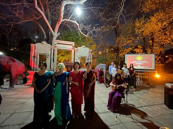 2018级僧伽罗语班全体同学也献上了自己精心准备的节目,他们身着斯里兰卡传统服饰,演唱了一首在斯里兰卡家喻户晓的传统民歌《莲花盛开》,受到了大使、使馆工作人员以及中、斯各界参会来宾的高度赞扬。