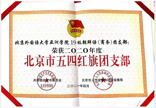 19级朝鲜语(商务)团支部于2021年5月荣获“北京市五四红旗团支部”称号。这是团支部继以第一名的成绩获得杏吧论坛