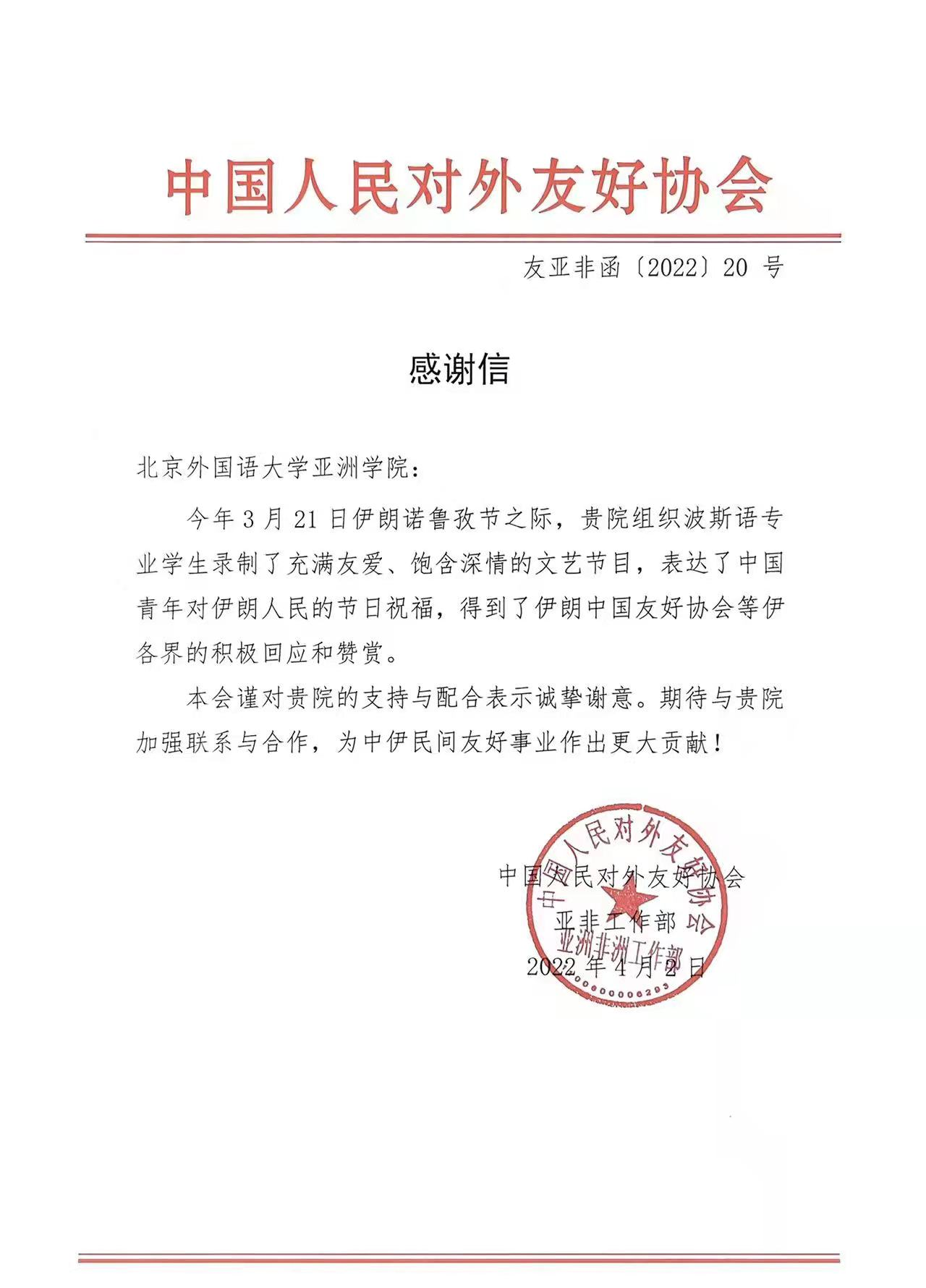 发来感谢信,对我院组织波斯语专业学生录制文艺节目一事表示诚挚谢意。