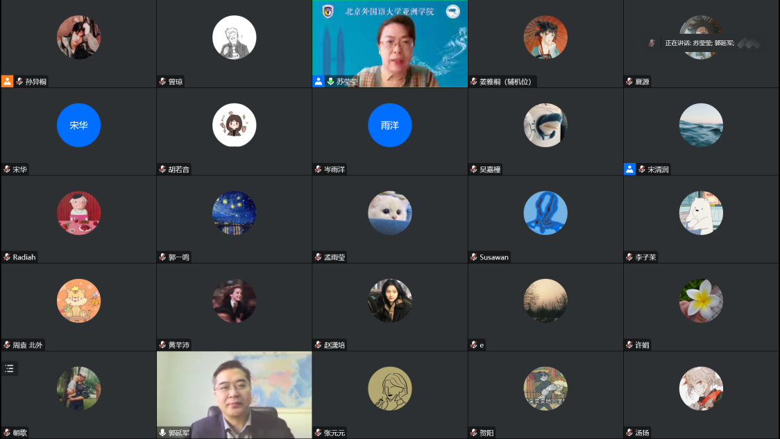 苏莹莹院长主持的“北外亚洲讲堂”邀请外交学院国家安全学院院长、亚洲研究所所长郭延军研究员线上做客,作题为“美国对华战略竞争背景下的中国周边外交”主题讲座。