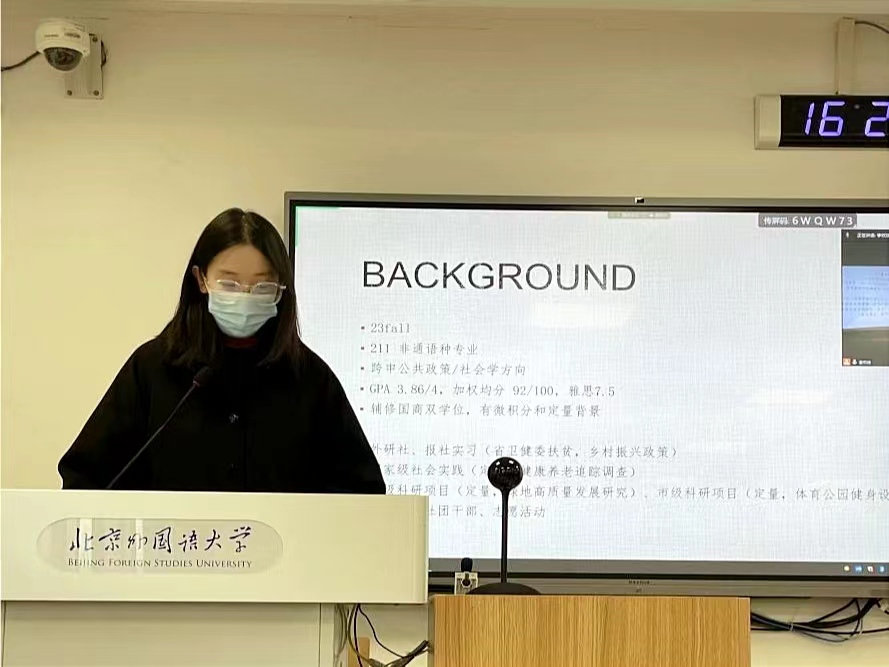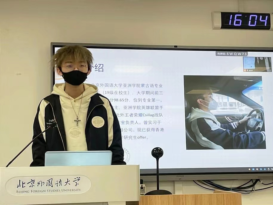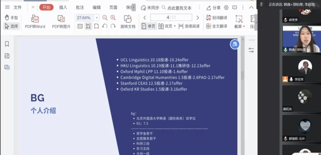 19级朝鲜语(商务)专业郑怡果,成绩优异,多次获得奖学金。在校期间,参与北京冬奥会志愿服务,在亚马逊、微软、外研社、北外智库等单位实习。目前已收到斯坦福、牛津、剑桥等offer。她在分享中强调,要保证志愿服务活动的含金量与深度参与,并详细地分享了信息检索方法以及申请季具体时间安排等内容,令同学们受益匪浅。