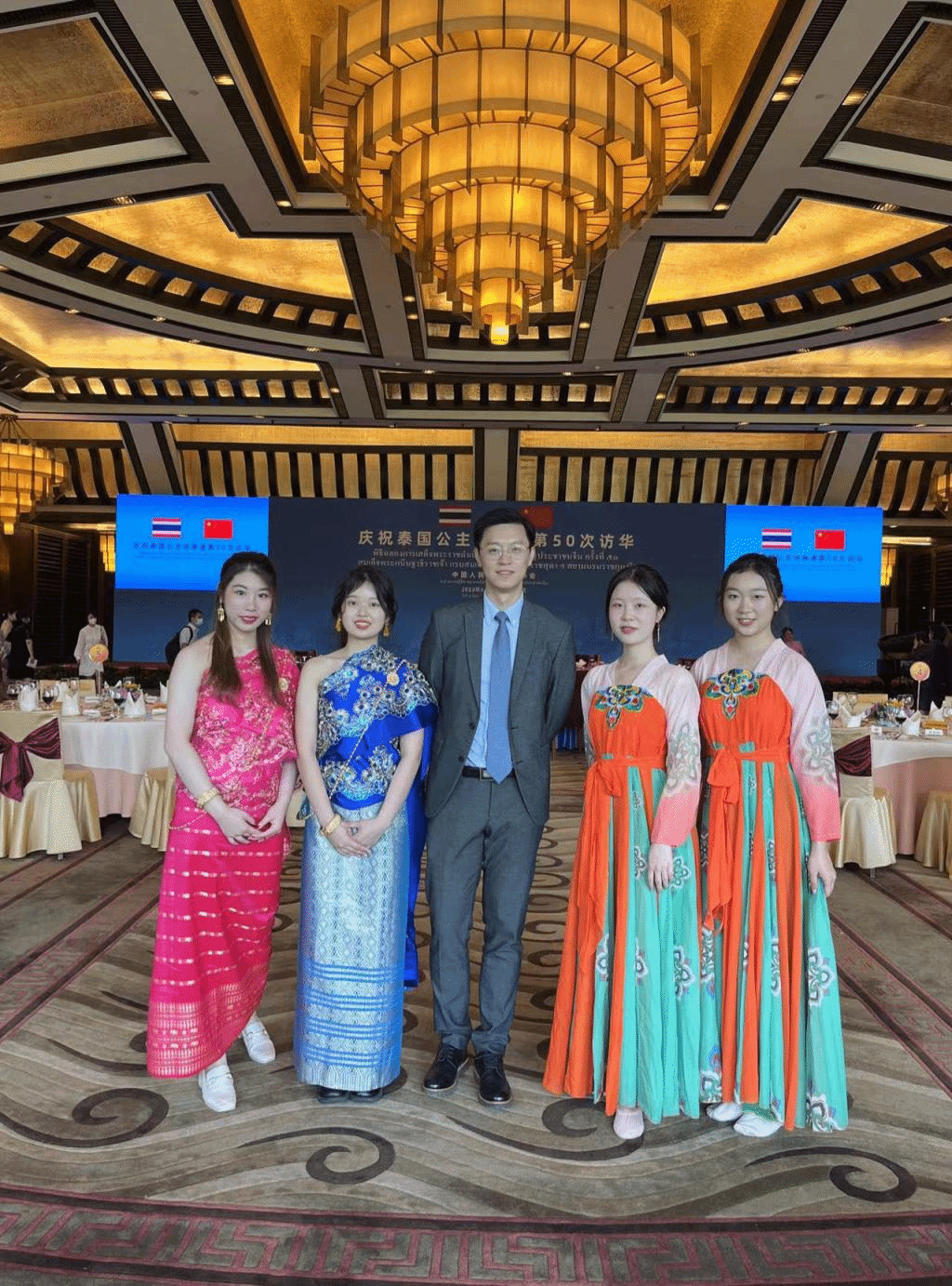 泰语专业2021级本科生受邀表演文艺节目,专业教师田霖为仪式和宴会担任翻译。
