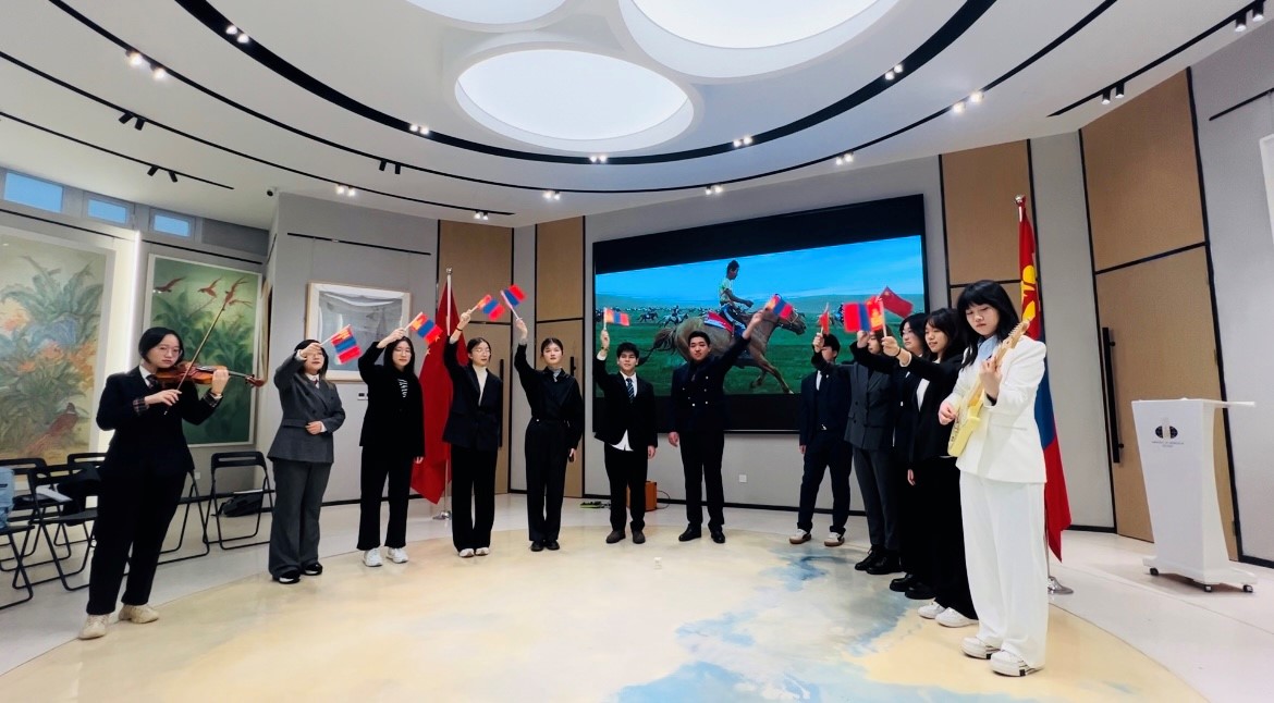 在交流活动中,蒙古文化信息中心主任萨林格女士现场为北外师生演奏了古典钢琴曲,蒙古语专业全体同学也献上诗朗诵《蒙古语》、合唱与乐器合奏《乌兰巴托之夜》等精心准备的节目,演出将活动气氛推向高潮。随后,满都呼参赞与北外师生互赠纪念品并合影留念。在茶话会环节,蒙古国使馆以当地传统美食招待北外师生,并带领北外师生参观使馆贵宾室、陈列室与图书馆。陈列室是中蒙友好往来的历史见证,图书馆整齐地摆放着中蒙图书互译的丰富成果。满都呼参赞鼓励北外学子精进学业,欢迎北外师生常来交流。同学们深受鼓舞,表示将努力提高专业水平,做好中蒙友好交流的使者。