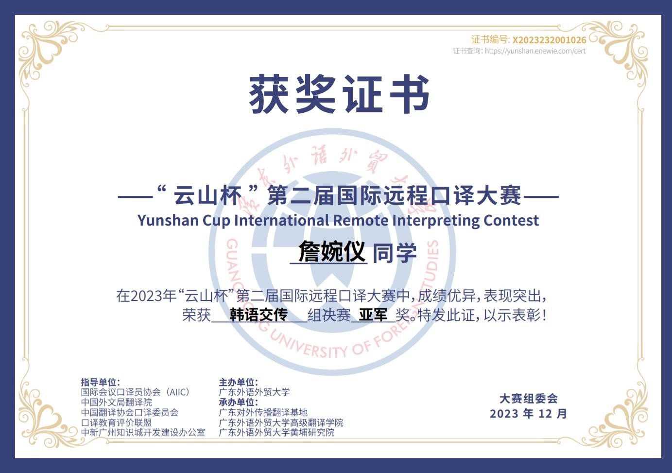 朝鲜语专业口译方向硕士研究生詹婉仪同学在本次大赛中发挥出色,成功进入韩语交传组决赛,并最终夺得亚军的好成绩。詹婉仪同学的指导教师李丽秋教授也被评为本次大赛的优秀指导教师。