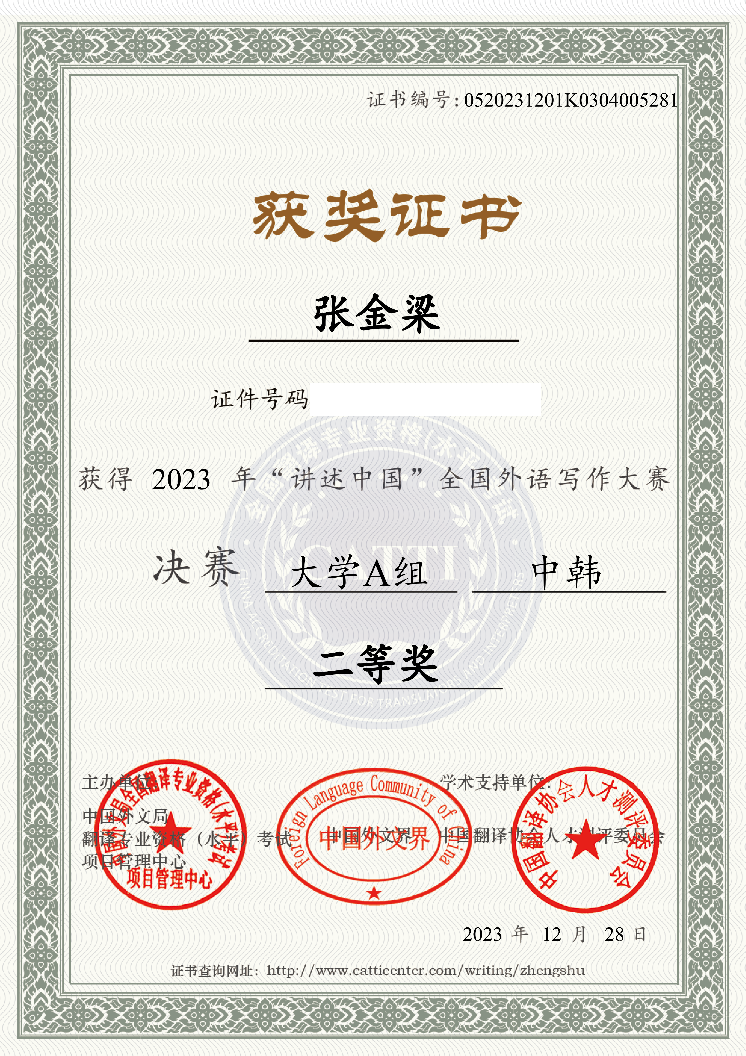 朝鲜语专业本科学生张金梁在第二届“讲述中国”全国外语写作大赛决赛中荣获二等奖,指导教师安仁焕教授荣获“优秀指导教师奖”。