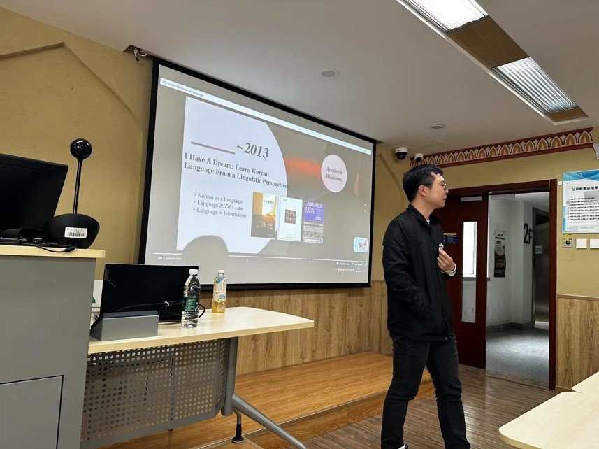 朝鲜语专业10级校友费立回校举办讲座,主题为“你好,世界:叩响自然语言与计算机交汇的大门”。朝鲜语专业教师及多名同学参与,讲座由朝鲜语专业周晓蕾老师主持。