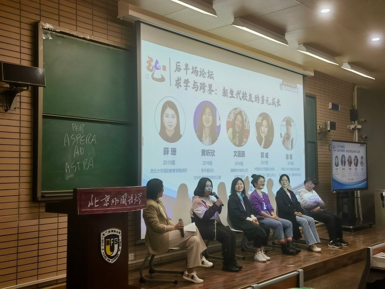 郭颂分享了自己在文学教育事业笃行二十余年,在文学、逻辑学等领域广泛涉猎的经历,使同学们受益匪浅;何晨讲述了自己在大韩航空深耕二十年的经历和感悟,为在校生毕业后进入韩企提供了宝贵建议和指导;黄婉迪讲述了自己跨国跨行业主动求变、主动转型的历程,并强调把过往经历凝聚成个人核心竞争力的重要性;管施霖分享了自己坚定追求梦想、跨至互联网行业的经历,激励同学们在选定的方向上坚定前行;赵洁讲述了自己跨越部委、央企、外企的多维职业历程,并结合自身对外语专业优势的洞见,勉励同学们以语言专业为跳板,将人生之路走得更宽更广。