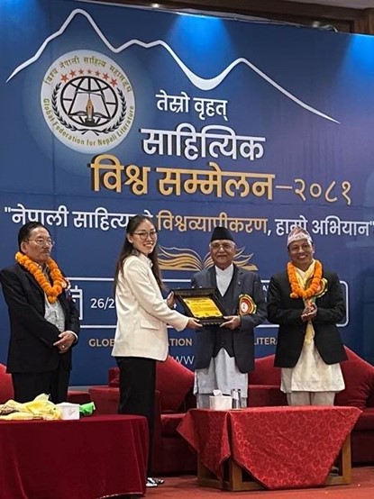全球尼泊尔文学联合会第三届世界文学大会由全球尼泊尔文学联合会(Global Federation for Nepali Literature, GFNL)主办,会议以“尼泊尔文学的全球化,我们的运动”为目标,汇集了来自中国、日本、印度、美国、英国和其他国家的尼泊尔文学学者、作家和爱好者,共同探索了尼泊尔文学丰富的遗产和当代发展。大会表彰了对尼泊尔文学的传承、发展、创新、宣传、推广等工作做出突出贡献的专家,由尼泊尔总理K.P.夏尔马·奥利颁发荣誉奖状。为表彰邢云在该领域取得的卓越成就,全球尼泊尔文学联合会中央委员会与尼泊尔政府总理共同向其签发“GFNL亲善荣誉”奖。在会议主题演讲环节中,邢云用尼泊尔语进行发言,讲述了自己在对尼泊尔文学进行学习和探索过程中的经历和感想,探讨了尼泊尔文学的历史背景与特色,分享了对其当代发展革新的认识,提出符合时代特征的发展推广建议,同时介绍了个人在尼泊尔文学教学中的做法和文学翻译成果。发言受到大会组委会和在场专家高度评价,有效促进了我校尼泊尔语言、文学教学和研究在国际领域的参与和合作。