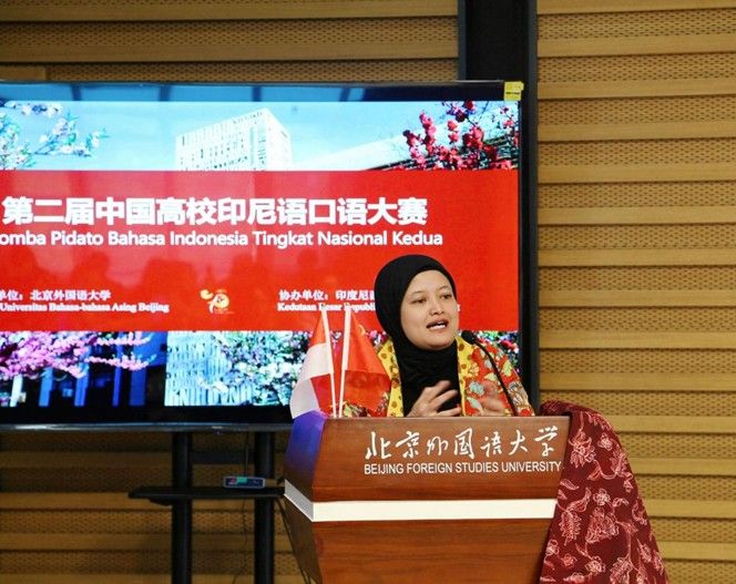 主办,印尼驻华使馆协办,共有来自北京大学、上海外国语大学、广东外语外贸大学等15所高校派出46名优秀选手参赛。北外党委常委、副校长,教育部外语教学指导委员会非通用语种专业教学指导分委员会副主任委员赵刚、印尼驻华大使馆公使衔参赞艾菲(Nur Evi Rahmawati)出席开幕式并致辞。