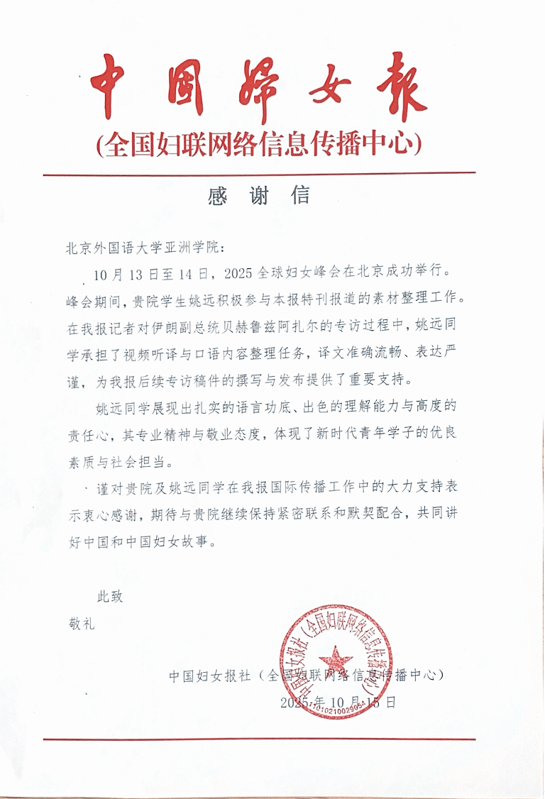 波斯语教研室选派2025级亚洲地区研究专业研究生姚远同学参与了《中国妇女报》特刊报道的素材整理工作。在记者对伊朗副总统贝赫鲁兹阿扎尔的专访过程中,姚远同学承担了视频听译与口语内容整理任务,译文准确流畅、表达严谨,为后续专访稿件的撰写与发布提供了重要支持。姚远同学展现出扎实的语言功底、出色的理解能力与高度的责任心,其专业精神与敬业态度,体现了新时代北外青年学子的优良素质与社会担当。