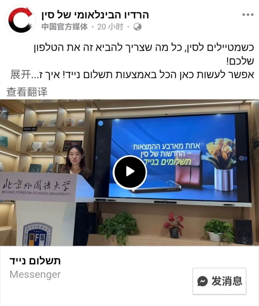 希伯来语专业举办“用希伯来语讲述中国文化”活动,受到中央广播电视总台希伯来语部的关注与报道。活动视频被国际台采纳并发布至其官方网站及社交媒体平台,在海外受众中引发积极反响。(链接附文末)